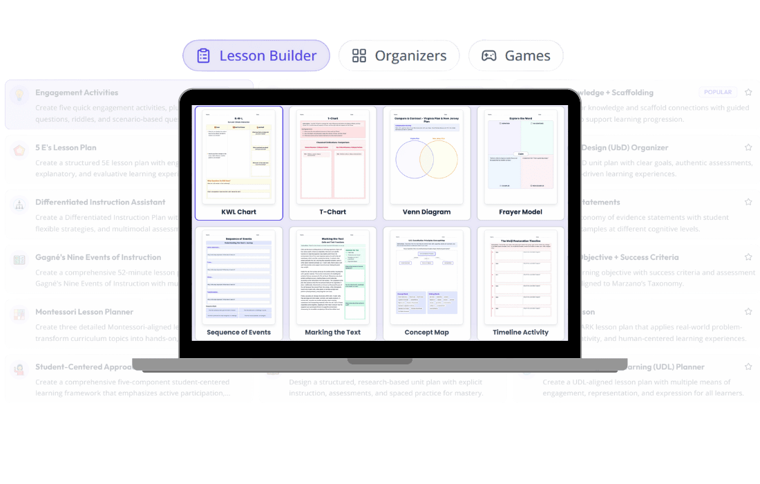 While we can't wave a magic wand and solve every classroom challenge, our research-based tools help you plan lessons, create materials, games and graphic organizers more easily—freeing your time to focus on what truly matters: real student growth.
